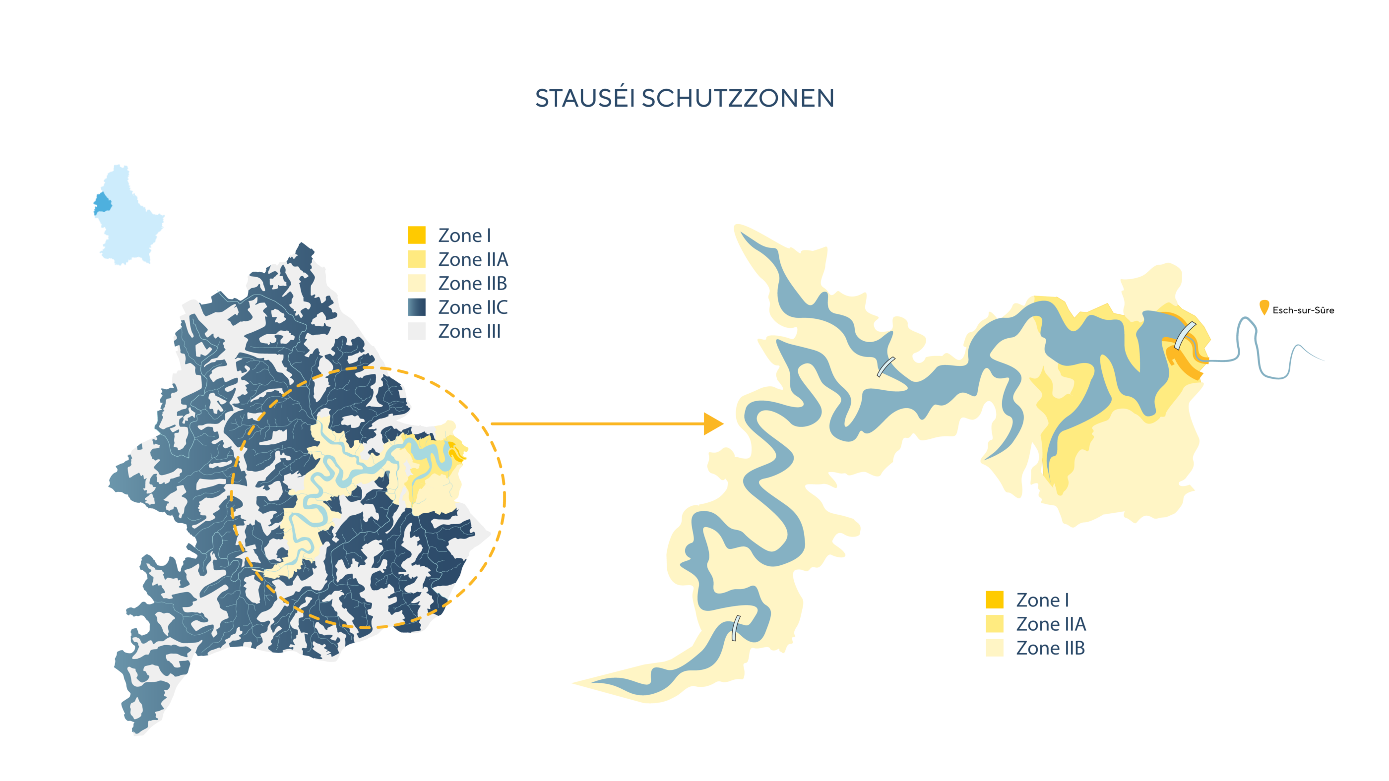 Le Lac de la Haute-Sûre est classé comme réserve d’eau d’intérêt national. Afin de protéger préventivement la qualité de l’eau, des zones de protection ont été délimitées autour du lac par le règlement grand-ducal du 16 avril 2021. Les zones de protection s’étendent en amont du barrage d’Esch-sur-Sûre, sur la partie luxembourgeoise du bassin versant de la Sûre.